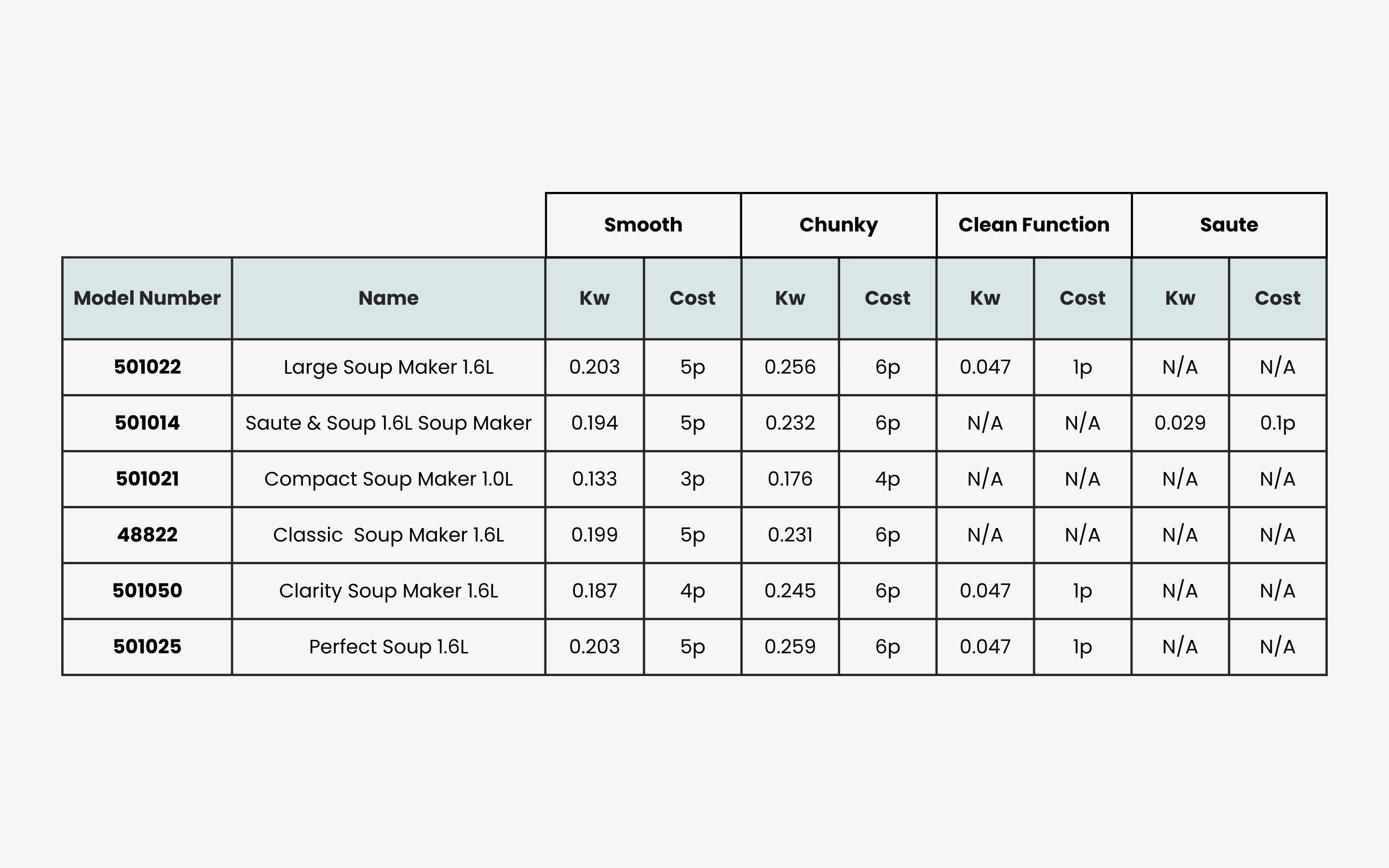 Take a look at the handy table below to find out just how energy efficient our range of Soup Makers are!