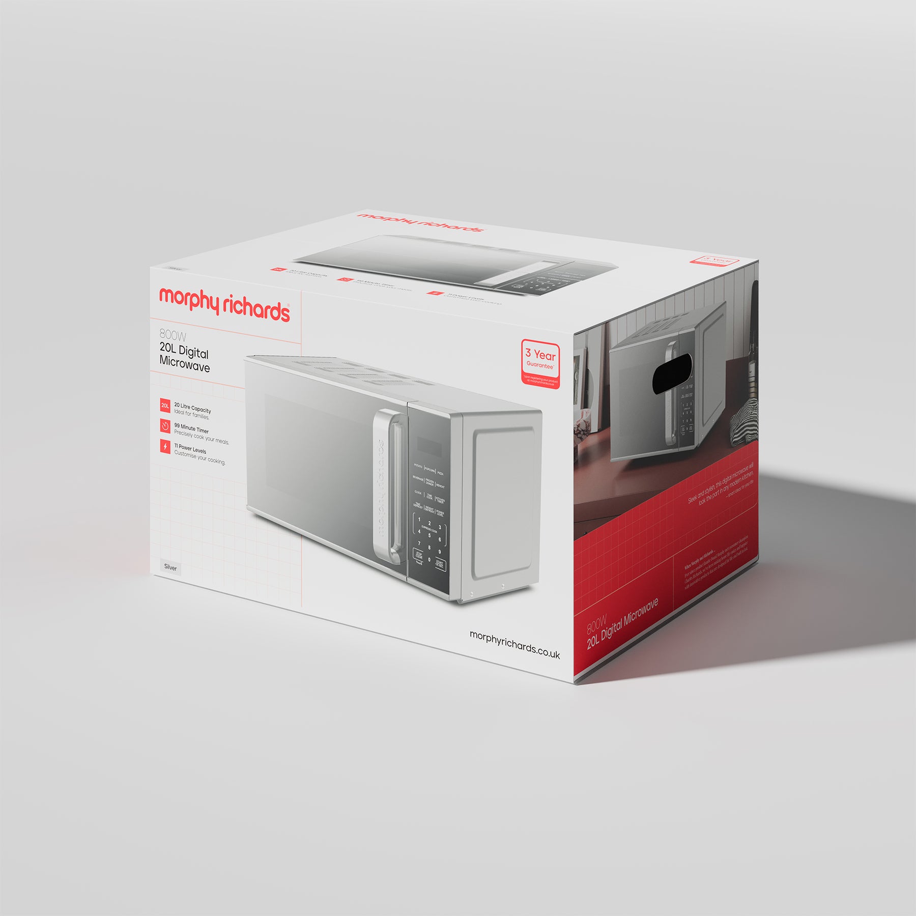 Looking to elevate your kitchen? Look no further with the Morphy Richards 20L digital microwave, designed to handle a wide range of cooking needs while being efficient and looking stylish. This microwave is designed with a powerful 800W output with a stainless steel handle ensuring you have a firm grip acting as a safety feature while also adding a touch of style. This large microwave offers 11 power levels giving you a wide range of heating options, including a defrost setting giving you full control over your cooking. Our digital microwave has a 20 litre capacity meaning you can fit full sized plates inside making it perfect for family meals or reheating. The 99 minute and 99 second timer adds convenience for longer cooking requirements making it one of the best microwaves. There is no denying that this microwave will elevate your kitchen so get yours today!