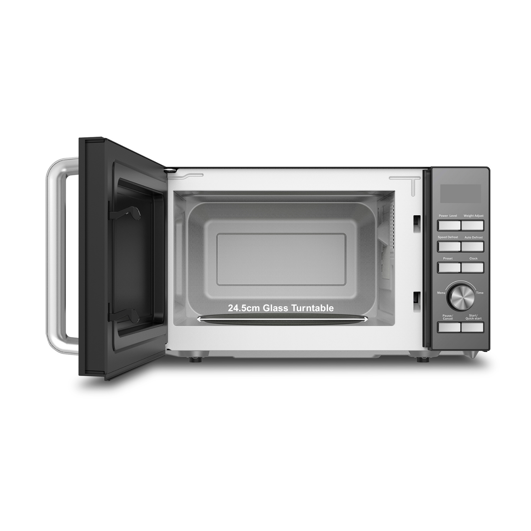 24.5cm Glass Turntable: The 24.5cm glass turntable smoothly spins food for an even cooking process.