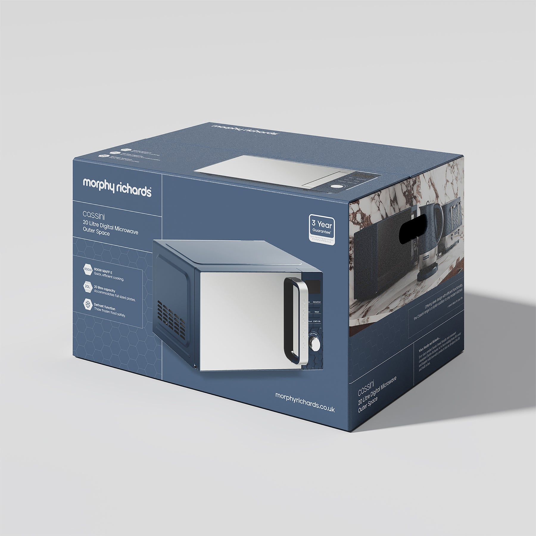 The perfect kitchen essential, the Morphy Richards Cassini 20L 800W Digital Microwave is designed to handle a variety of cooking needs with efficiency and style! The Cassini range features a distinctive hexagonal design across the kettle, toaster, and microwave, creating a cohesive and modern aesthetic for your kitchen.