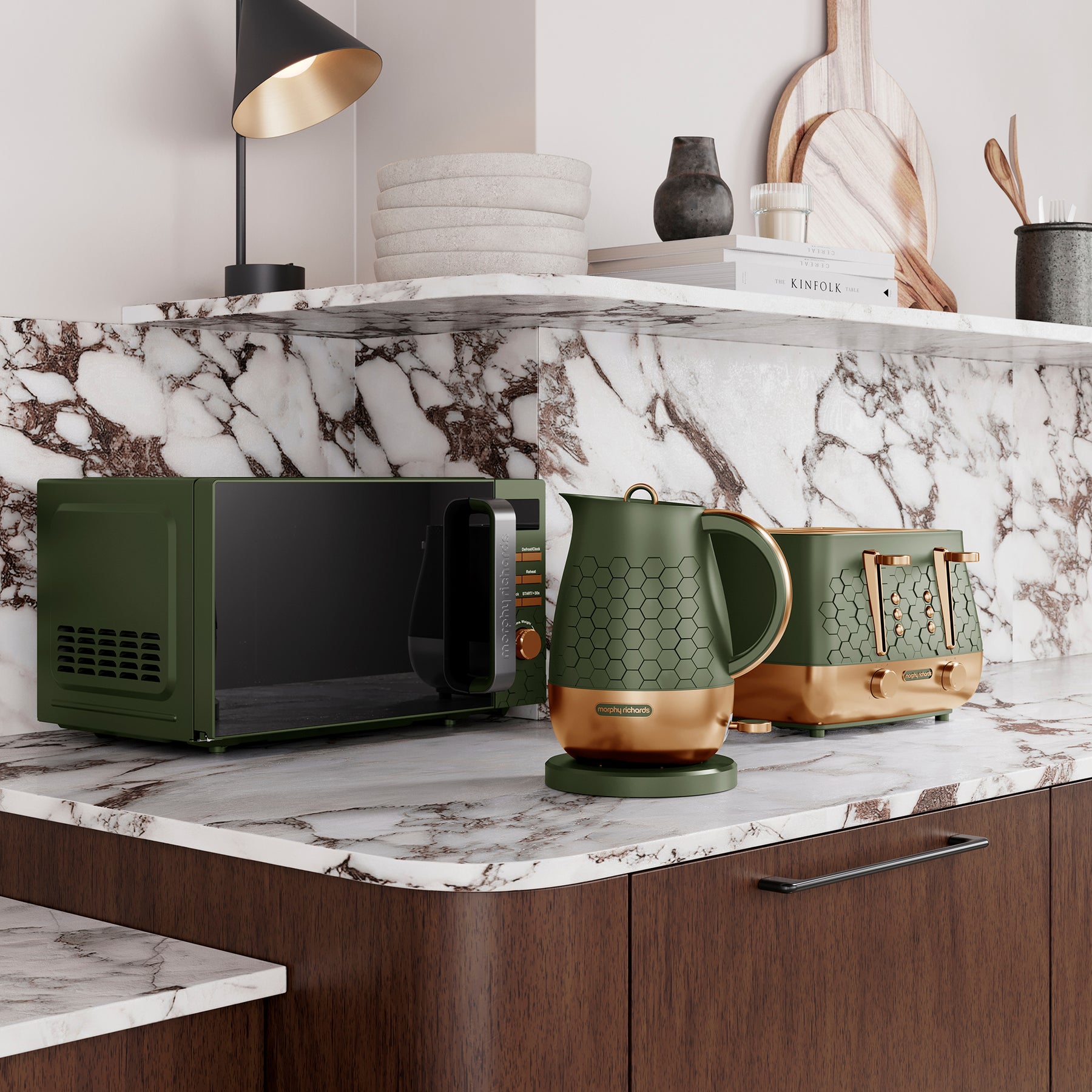 Its spacious 20-litre capacity and 255mm glass turntable easily accommodate full-sized dinner plates, making it perfect for family meals and reheating leftovers. Further features including the 95-minute timer, end-of-cook signal, and 6 power levels including a defrost function add convenience to every use. There is no denying that this Morphy Richards microwave is an ideal choice for those looking to upgrade their kitchen. Complete your aesthetic with the matching kettle, toaster, and microwave set for our Cassini range