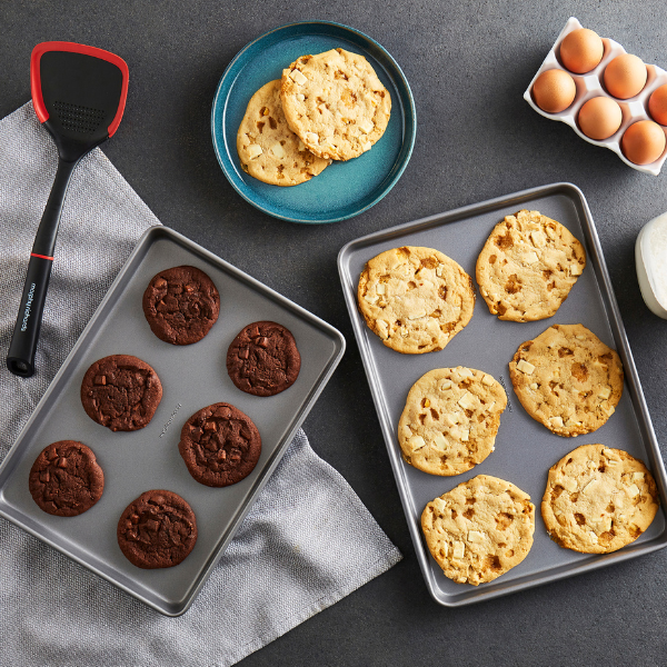The double non stick coating is designed for reliable release, making it easy for foods like roast potatoes, roasted vegetables, cakes, or cookies to slide right off the tray.